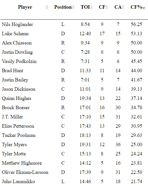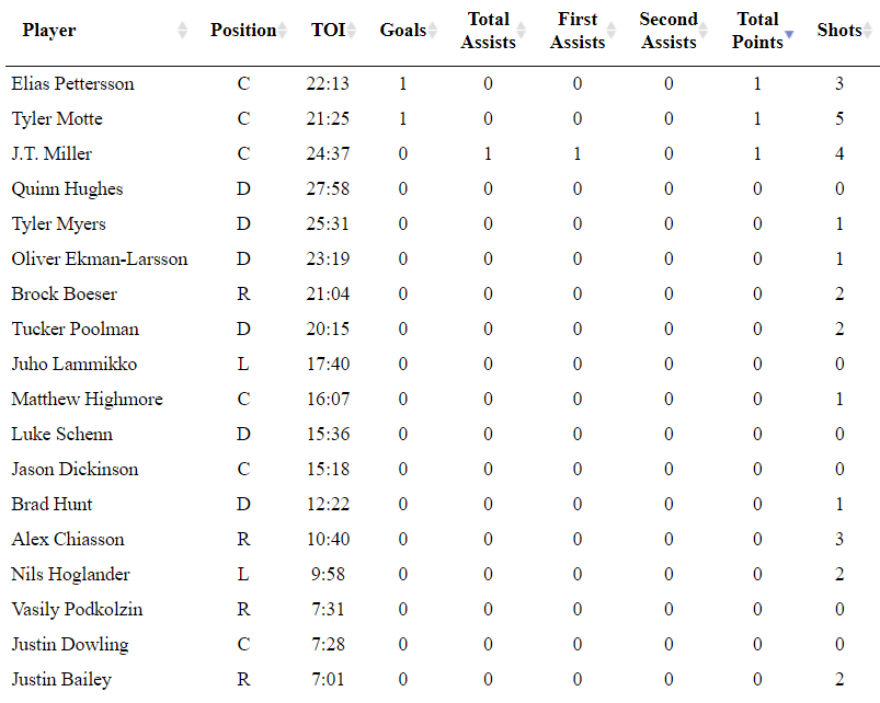 The Lotto Line looked good in its first period back as a trio. Miller was a driver of play and it was great to see him back in the lineup. They spent a majority of their ice time in the offensive zone and though Pettersson had a couple of slip-ups, Boeser and Miller played well and the line as a whole looked good.