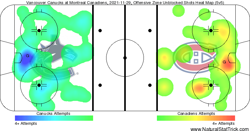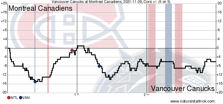 It was a full 20 minutes of five-on-five for the period. The Canucks controlled almost all of the play in the period aside from a stretch around the halfway point of the period where the Canadiens had some scoring chances on Demko.
