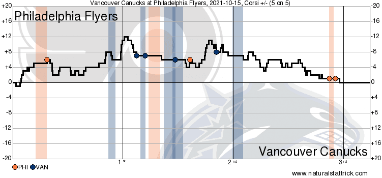 After 20 minutes, the Flyers had a stronghold on the possession numbers. It’s nights like this where you have to appreciate having a strong goaltender like Demko, he was excellent and kept the Canucks in the game.
