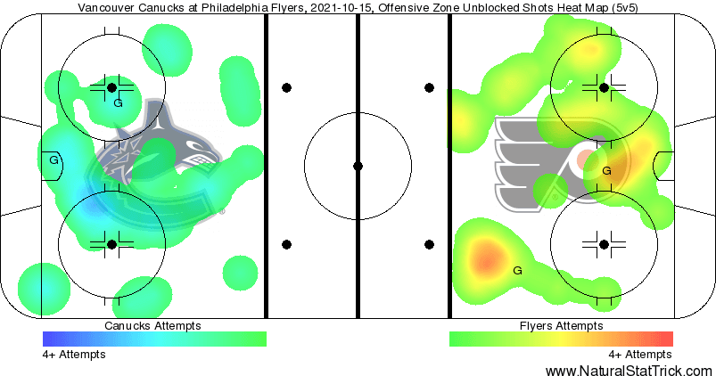 At the point of the goal, the Flyers had an 8-0 lead on the shot chart. They were sustaining pressure on the Canucks for what felt like the entirety of the opening eight minutes of the game.