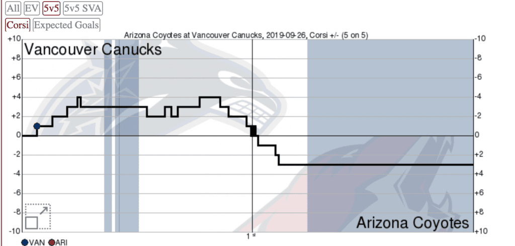 - Nikolay Goldobin only played 6:32 through the first two periods, but played a ton in the third period with the Canucks looking to tie it. Both Jake Virtanen and Goldobin were given lots of opportunities in the third period to try and earn their spot. They each finished with just over 13 minutes of ice time. Travis Green recently commented that Goldy had a “quiet camp”, while saying that Virtanen has just “kind of been there”. Both players failed to truly differentiate themselves from the competition this preseason, so it’ll be interesting to see if they make the opening night roster against Edmonton.