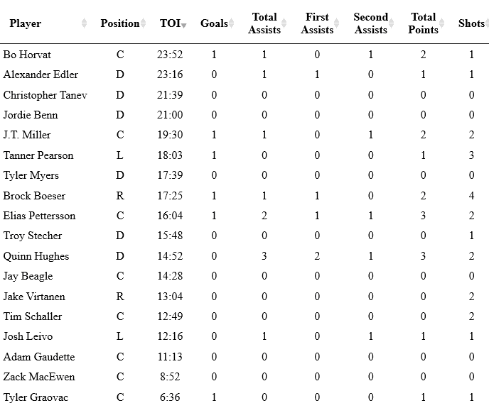 Early results form the first period was that they were great on the powerplay and that’s why they are leading at this point and the line of Josh Leivo, Adam Gaudette and Jake Virtanen controlled a large majority of the pace of play at five-on-five.