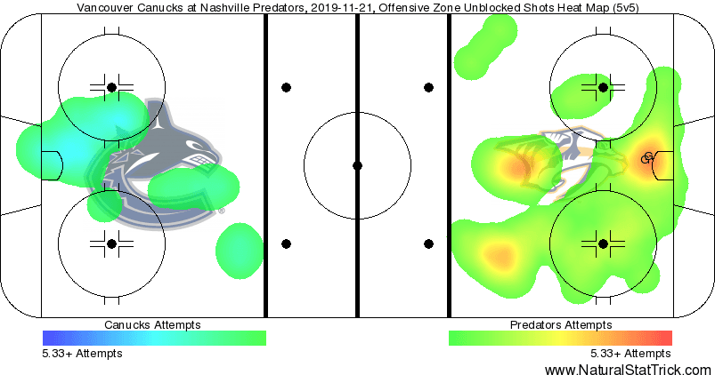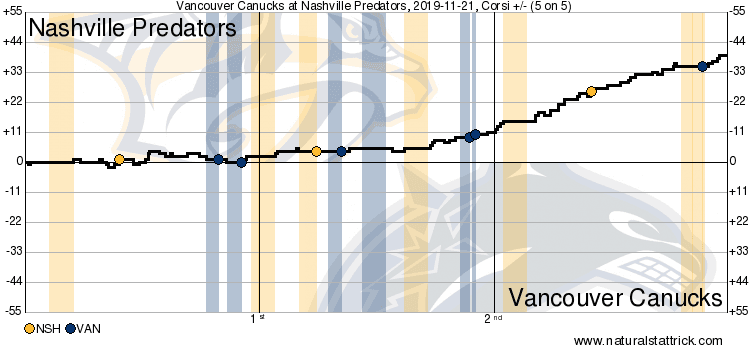 The Canucks were dominated in the advanced stats department tonight. The Preds were all over them at times, without the powerplay production tonight could have been a very different story. The Preds dominated the Corsi battle as the controlled 71.67% of shots towards the net and also controlled 68.57 of the shot share at all strengths. Jacob Markstrom deserves a very expensive steak tonight in Nashville.