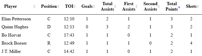 -The Canucks powerplay was outstanding Thursday night as they were able to score 5 powerplay goals on 6 attempts and had the Nashville Predators chasing the play throughout the night. All 5 players from the first powerplay unit registered at least 2 points.