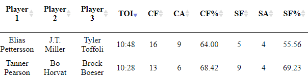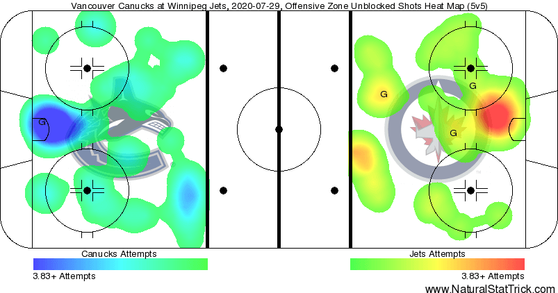 Pettersson had a one-timer that was destined for the top corner if Hellebuyck didn’t get his glove on it. Aside from the one Pettersson shot, the power play didn’t look good. The second unit was unable to gain the zone and the Jets easily killed off the penalty.