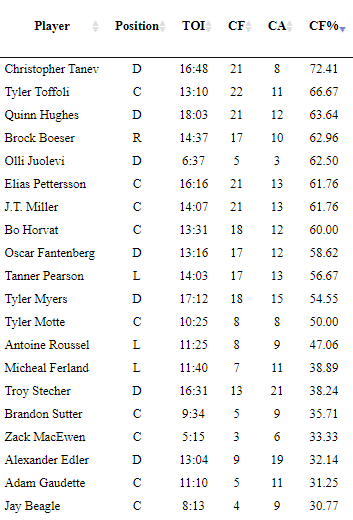 Later on in the game, Travis Green decided to put together the defensive pairing of Quinn Hughes and Tyler Myers. That pairing had been used a lot by Green when the team was trailing or he wanted a shot of offence.