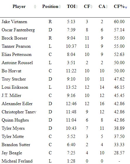 Well, we saw the lineup and this team looks a lot more average without Toffoli in the lineup. Eriksson was back in the top six and Virtanen skated on the fourth line with Tyler Motte and Jay Beagle. The bottom six was now centered by Brandon Sutter and Beagle.