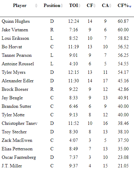 With the lineup shuffle, Zack MacEwen drew into the lineup for his first NHL postseason game. Jake Virtanen would be moved up to the third line and Antoine Roussel brought his bruised eye into action to round out the third line with Brandon Sutter.