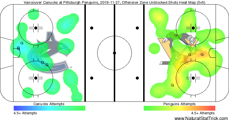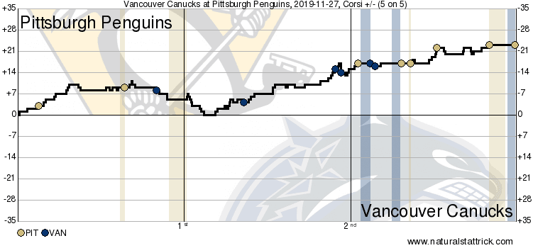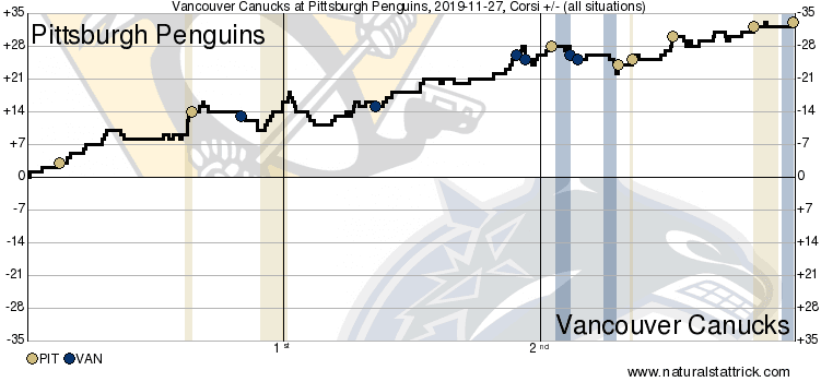 The Canucks came into Wednesday night’s tilt to take on the Crosbyless Pittsburgh Penguins. The lineup was due for a shake up after their horrendous performance at 5-on-5 over the past 5 games. Brock Boeser and Elias Pettersson were split up to start a game for the first time this season and that resulted in a top six group that consisted of Pettersson-Miller-Goldobin and Pearson-Horvat-Boeser.