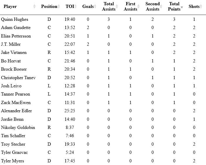 A final good note would be Quinn Hughes’ three points, who is now about all other rookies in points aside from Cale Makar.