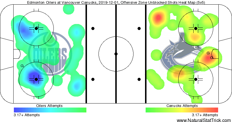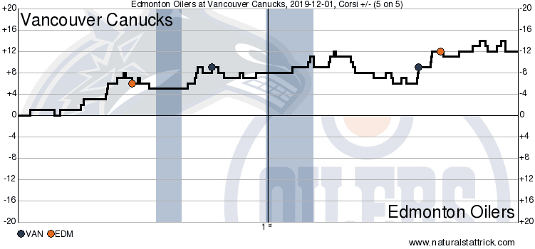 This game was a lot of fun to watch, with back-and-forth chances for both teams which included some great rushes from Connor McDavid and sustained pressure by the Canucks. The Lotto Line seemed to be in to offensive zone the most while Horvat seemed to matchup against Draisaitl or McDavid.