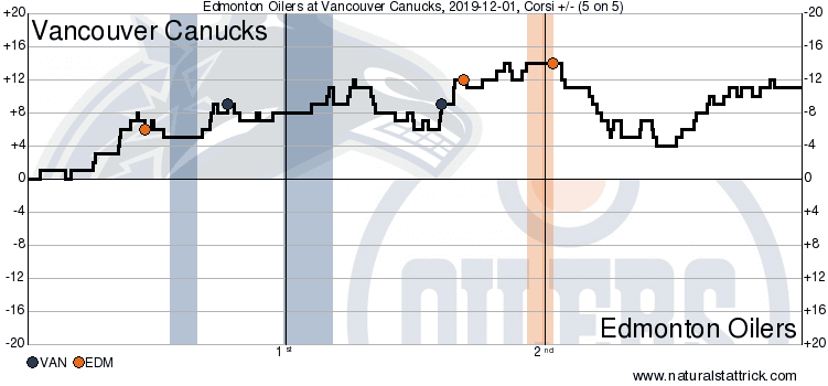 The Canucks outshot the Oilers 12-7 in the first period. They provided most of the offensive pressure and it shows when you look at the Corsi%. Every single Canucks player aside from the fourth line had a positive Corsi% after 20 minutes. The fourth line did only play for about a minute and a half in the period but it felt like the Canucks had an extra step on the Oilers in this back to back situation. 1-1 After 20 minutes.