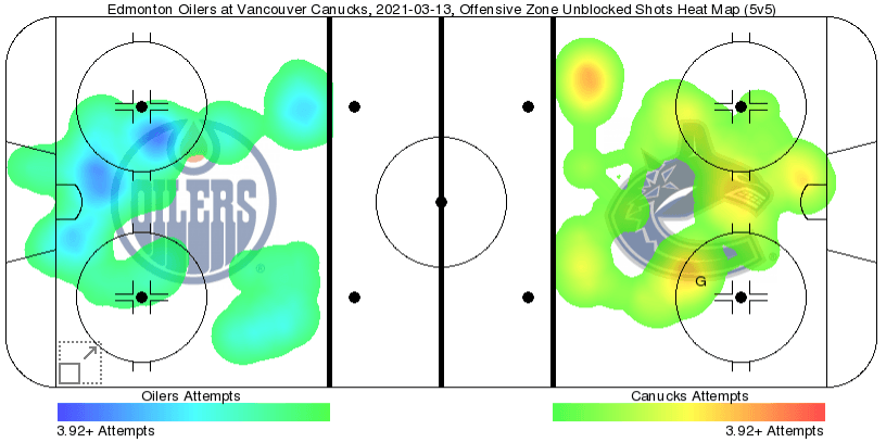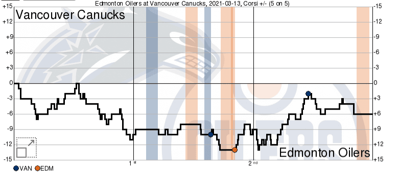 Edmonton continued to generate a lot of low-risk pressure against the Canucks as the duo of McDavid and Draisaitl had their way with the Canucks in the first period. The Oilers had 13 shots on net in the first period. McDavid was on the ice for 11 of them and Draisaitl was on the ice for 10 of them.