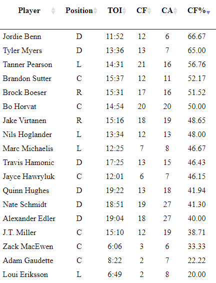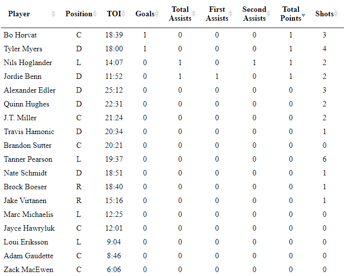 Thatcher Demko: It’s ridiculous how good Demko is playing lately. He is once again the top performer in this game. He made 34 saves on 35 shots and came through in the clutch once again.