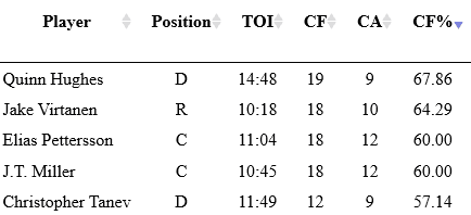 Quinn Hughes was a top performer once again, he played 28:04 tonight (20:28 at 5on5). That’s a career high for the 20-year-old defender, who had just set his previous career high a few days prior against the San Jose Sharks. There’s not much more that can or needs to be said about Hughes. He moved the puck well, had a 63.89 Corsi percentage at evens, and was good in his own zone. He is quickly becoming one of the best defencemen in the league and also making a case to be the best rookie in Canucks history.