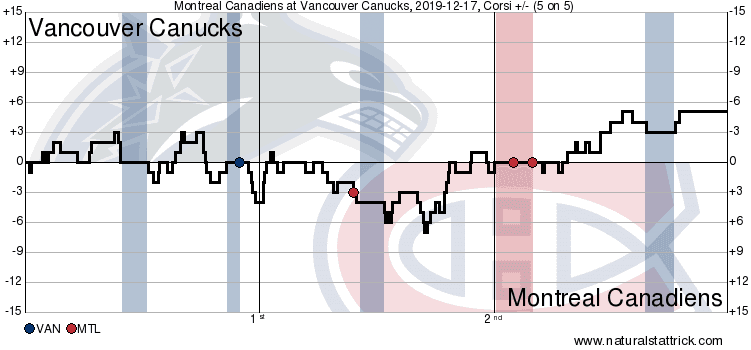 The Canucks as a whole were controlling the shot share in the first period and though there weren’t a ton of dangerous chances for either team, it felt like the Canucks were ready for their well-rested opponent. The Canucks did a great job of making the Canadiens take shots from outside the high danger areas.