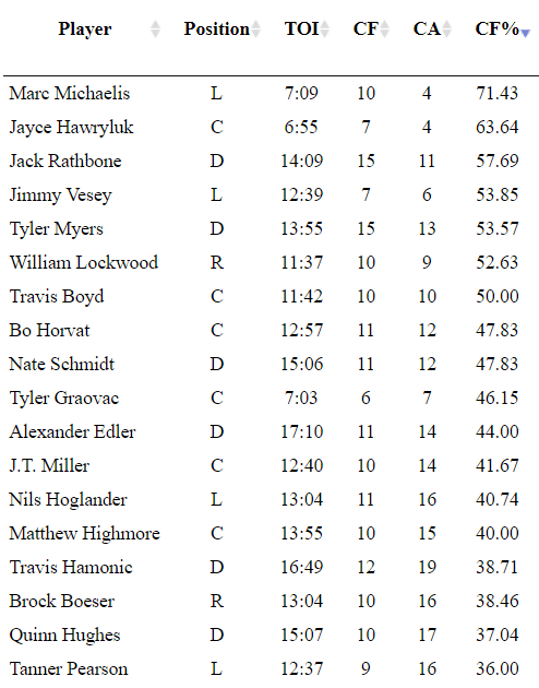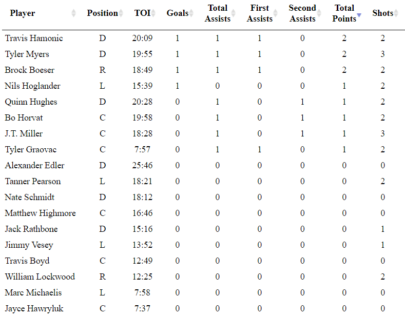 Thatcher Demko: He faced 40 shots and up until the final four minutes of the game, he stopped them all. It was another glimpse into the future that Demko can be one of the best goalies in the league.