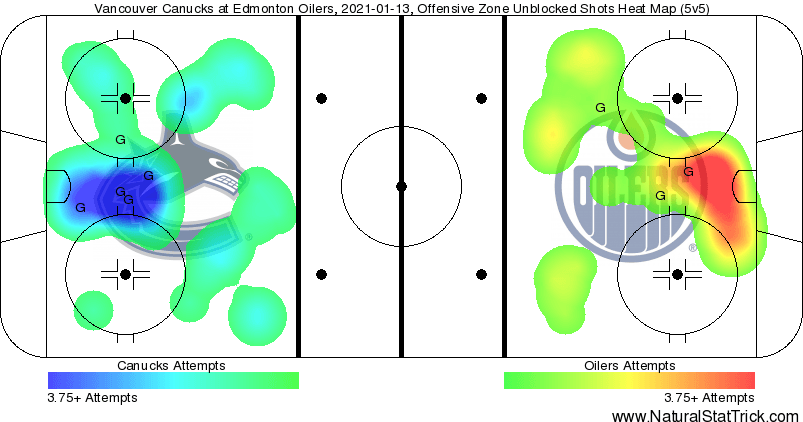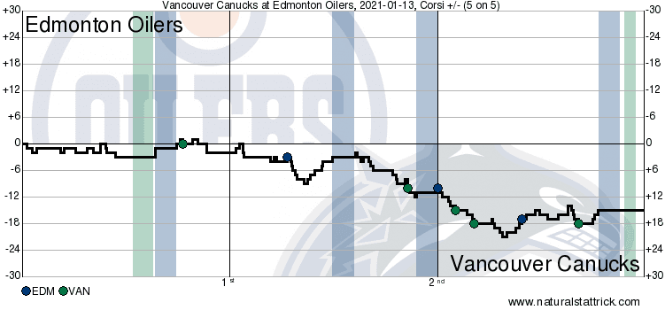 The Canucks outshot the Oilers 17-13 in what was a wide-open period. The Canucks lead the control of the possession through 40 minutes and really began to turn things on as the second period came to an end.