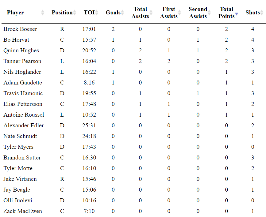 Brock Boeser: Brock Boeser had two 5-on-5 goals in the game. He looked to have gained a step and made his way down the wing with some real pace. He made the most of his four shots, burying two of them on Koskinen.