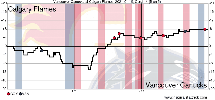 It was a tale of two periods. In the second frame, the Flames had 17 scoring chances to the Canucks’ one. The Canucks were outshot 3-20 in the middle period and saw their one-goal lead dissipate into a two-goal deficit after 40 minutes.
