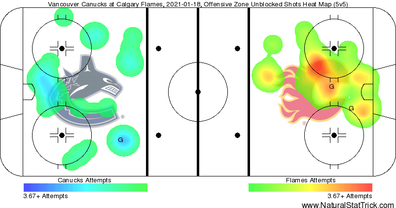 It was utter dominance for the Canucks in the first 20 minutes. They outshot the Flames 14-4 while attempting 27 shots in the period. The scoring chances were also in favour of the Canucks as they had 14 scoring chances compared to the Flames’ four.