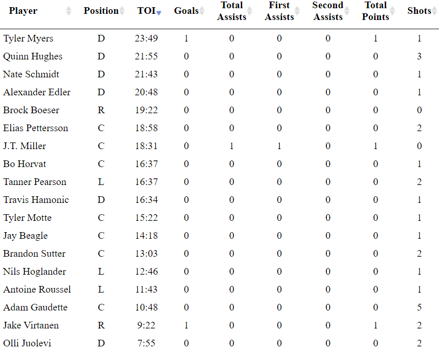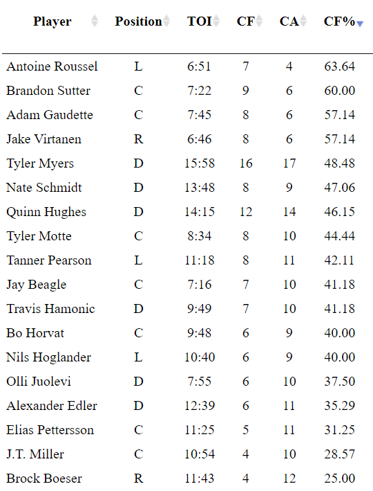 J.T. Miller made his season debut on Monday night. The top six had been thrown into a blender for two-thirds of each of their two previous losses and Miller’s presence helped stabilize the top-six group. With Miller in the lineup, that meant that Jake Virtanen was moved down to the third line to skate with Antoine Roussel and Adam Gaudette.