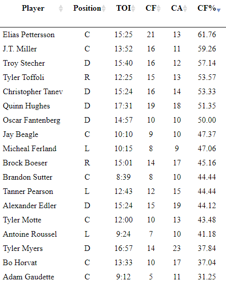 Virtanen and his 18 goals may be forced into the lineup if Ferland is in fact suspended. Brandon Sutter, Adam Gaudette and Antoine Roussel played under 10 minutes of 5-on-5 ice time. They could be candidates to be taken out of the lineup for a Virtanen, Zack MacEwen or even Loui Eriksson.