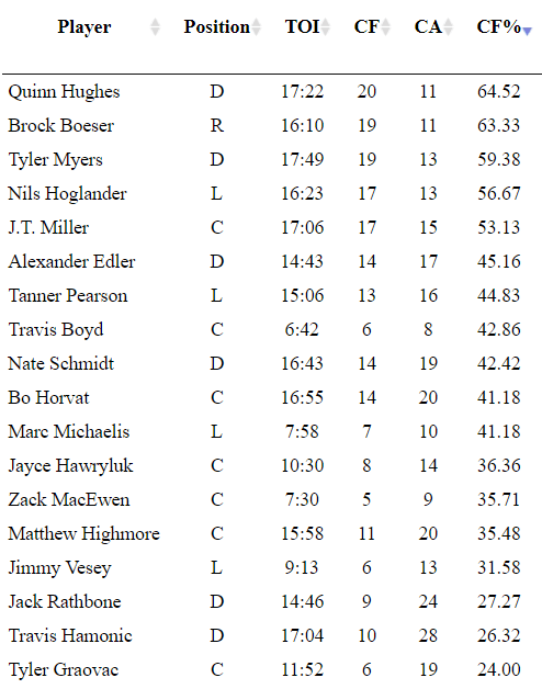 Nils Höglander: He was excellent in tonight’s game. 16:51 of ice time, six shots on net, two goals, six individual scoring chances and a 71.4% control of the shot share. He was forcing turnovers and capitalizing on the changes of possession that he created in his own zone. It may have been his best game of the season.