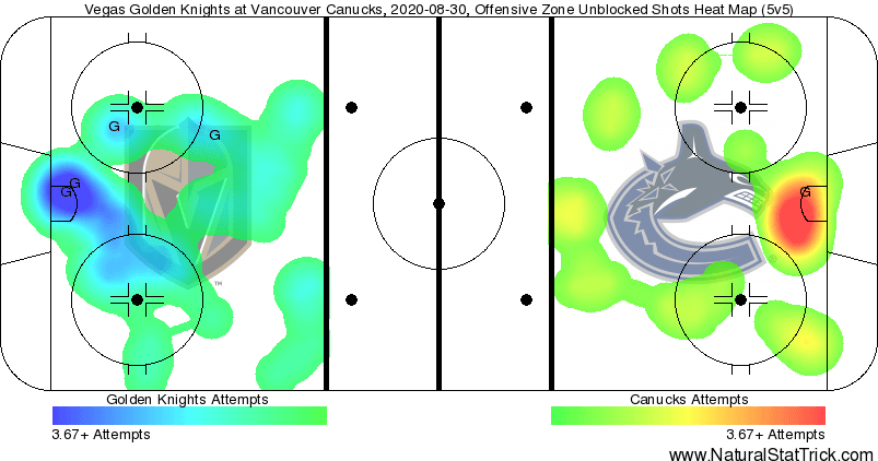 Heatmap from Canucks vs Vegas Golden Knights August 30, 2020 (courtesy of naturalstattrick.com)
