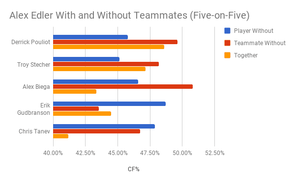 With the exception of Erik Gudbranson and oddly enough, Chris Tanev (who had a bizarrely inept season by shot metrics even considering his injuries) all of Edler’s partners performed better away from him than with him. One could speculate on a couple of different reasons this might have been the case. The first is that Edler undoubtedly saw the toughest deployment on the team both in terms of quality of competition and defensive zone faceoffs. I’m generally wary of this explanation because the effect of these factors is often overstated and the numbers we have available are sometimes unreliable, but Travis Green is a very tactical coach who favoured some extreme deployment strategies, so it deserves consideration.