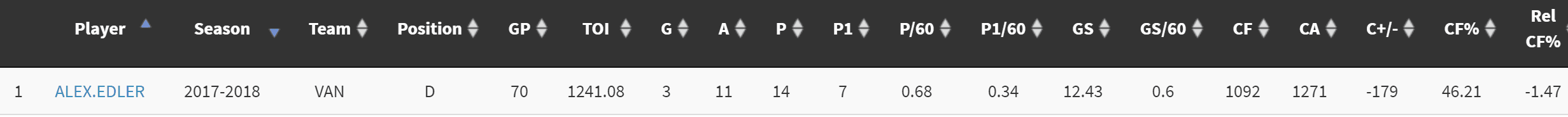 Edler also didn’t have a consistent partner this season. Edler performed reasonably well under Willie Desjardins playing the vast majority of his even-strength minutes with either Chris Tanev (2014-15, 2015-16) or Troy Stecher (2016-17). This season, Stecher was Edler’s most common partner, but they barely played half the minutes at evens that they saw under Willie Desjardins. The 470-odd minutes they played together were the least his seen with his most common partner since his infamous 2013-14 campaign under John Tortorella, when he posted good shot metrics but was burned by opposing offences for a 30% on-ice even-strength goals-for percentage.