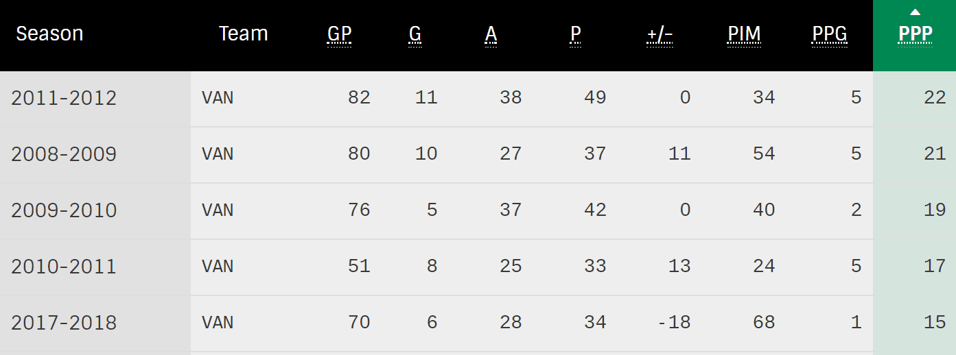 But the likeliest cause for his dwindling shot metrics is just that he’s getting older. Edler just turned 32 and played slightly more minutes per game than he saw in 2011. As a strong veteran presence on a blueline that’s as soft as it is young, he’s also facing some brutal matchups. This season it seems to have finally taken it’s toll.