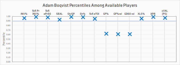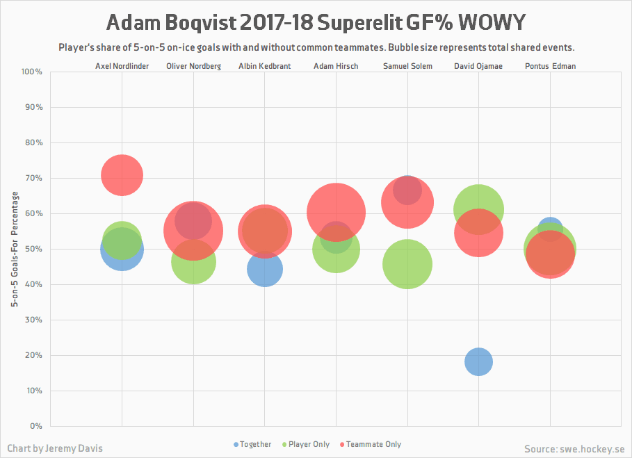 Even at the junior level, Boqvist finished around the 60th percentile of defencemen in the league at controlling goals scored — having a negative impact on many of his teammates’ ability to control scoring.