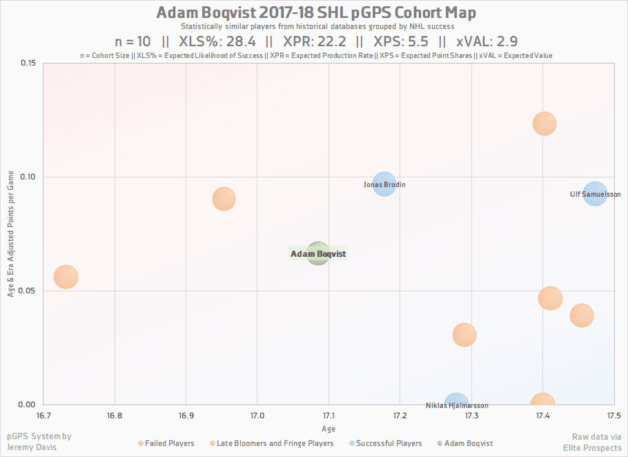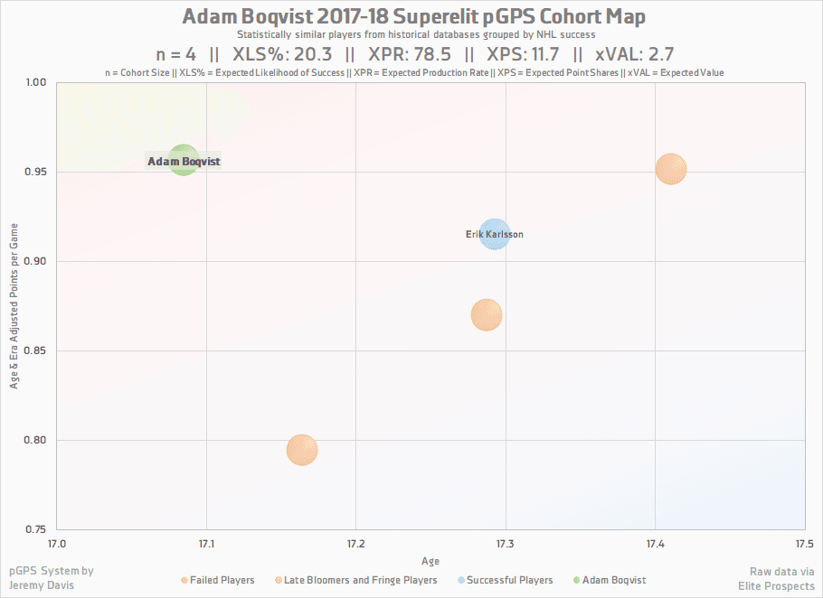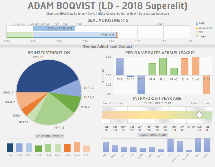 Boqvist’s lacklustre production in the Superelit is reflected in Jeremy Davis’s SEAL rating, which adjusts scoring based on situation, era, age and league factors. Here, the 17-year-old Swede ranks 25th among draft-eligible defenceman for adjusted points per game.