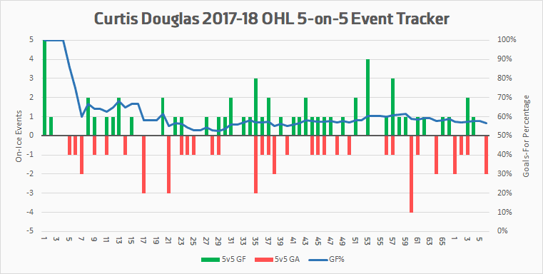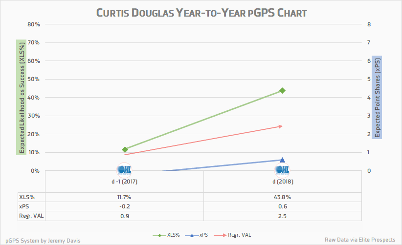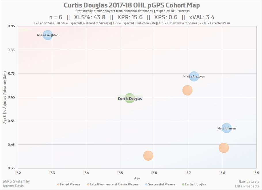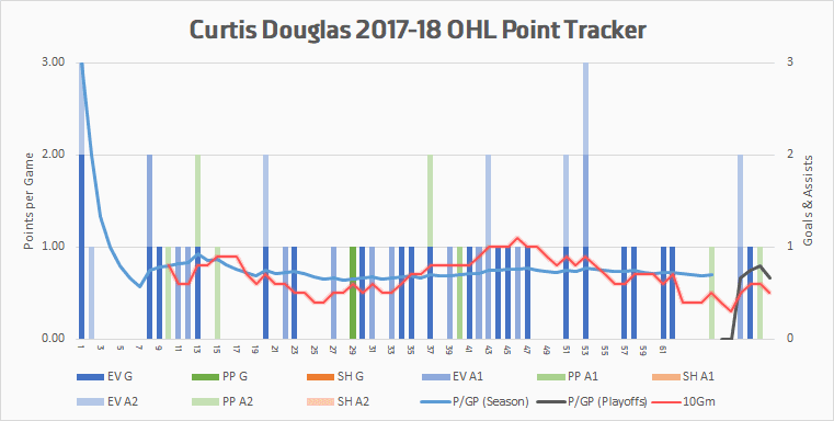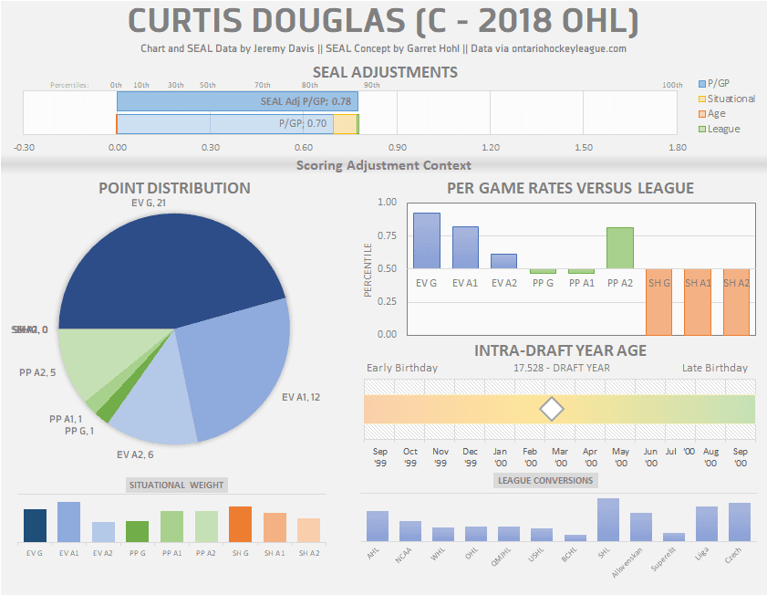 The damage that Douglas did this season came almost exclusively at even strength, with just seven power play points to speak of (and one more in Windsor’s short post-season). He ends up with a small situational bump that raises his scoring rate a little bit. A birthday right in the middle of the eligibility range, plus playing in the Ontario Hockey League, mean that age and league adjustments are virtually nonexistent.