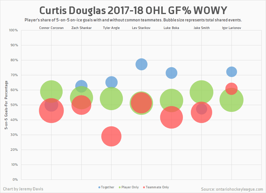 The WOWY charts below both indicate the Douglas’ linemates were better with him than without him, both in terms of point production and goal share. With a rebuilding team like Windsor, who have to wonder about who the linemates were playing with when they weren’t with Douglas, but it does indicate that he was having a positive effect.