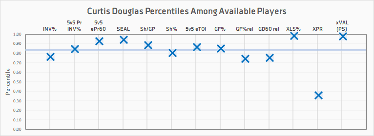Douglas looks good if not great in most of our statistical categories, standing out particularly in SEAL and XLS% (I’ll break down why further on, and explain why his XPR was so much lower).