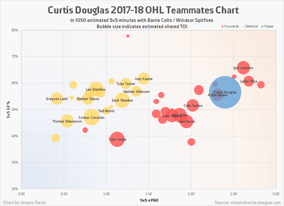 The main takeaway from this teammate plot (and the Scoring Network above) is that Douglas didn’t spend much time with consistent linemates. A mid-season trade certainly affects that, but Douglas still had rotating wingers whether he was with the Colts or the Spitfires, and in both cases he was looking at second or third line ice time. All of that conspires to make the production he did achieve that much more impressive.
