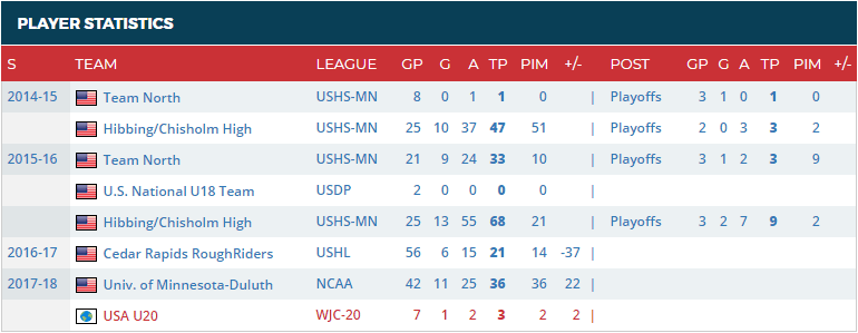 - Draft Year Team: University of Minnesota-Duluth (NCAA)