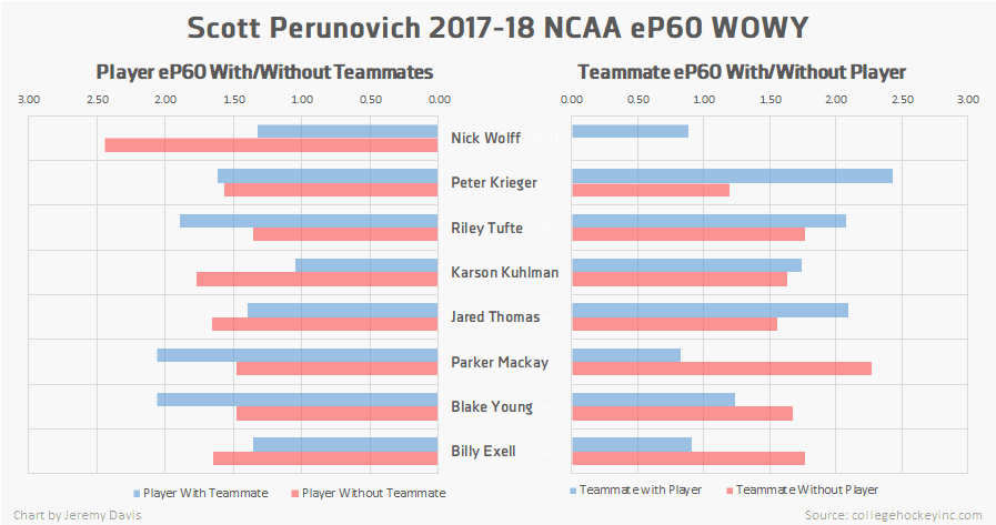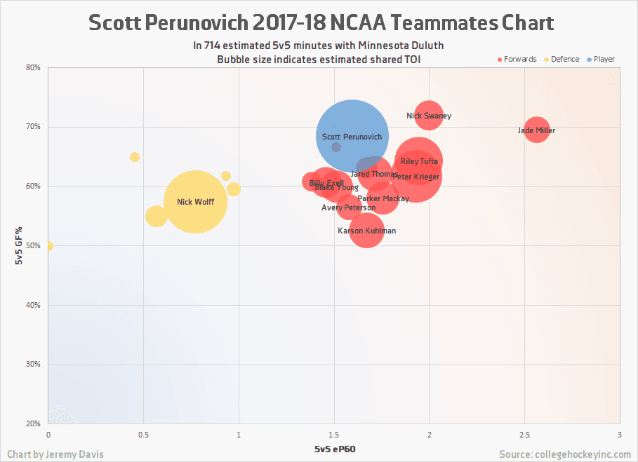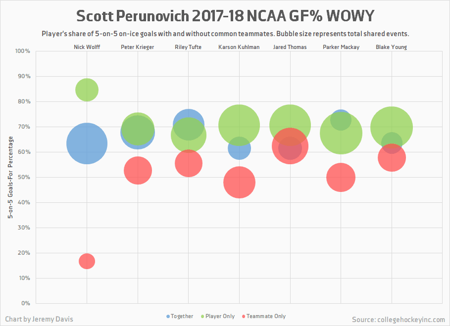 The above and below charts indicate that Perunovich spent the vast majority of his time with defensive partner Nick Wolff, and that Perunovich fared a whole lot better than Wolff when the two were separated. Against an array of other teammates, Perunovich consistently looks like a catalyst for positive change, in some cases bringing the goal shares of teammates from the 50-55% range up to the 70% range.