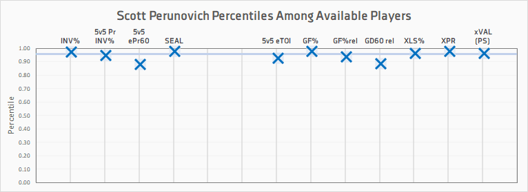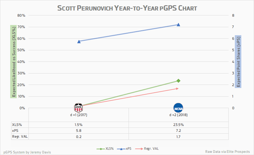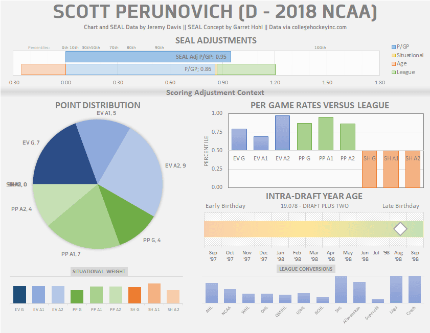 Perunovich loses a fair bit of value here due to his age, but then gains even more back when adjusting for the more difficult competition of the NCAA. He got his fair share of even strength scoring, but really made his name by running the UMD’s power play.