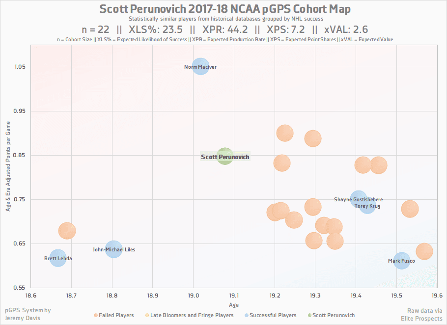 Looking at Perunovich’s cohort, some other smallish defenders like Torey Krug and John-Michael Liles pop into the picture. Because of his size (which isn’t a major factor in the formula, but does still place boundaries on potential matches), there weren’t a ton of players that met the similarity threshold – just 22 in fact. Overall though, the system projects a 24% Expected Likelihood of Success for Perunovich, which is a huge jump up from his previous seasons.