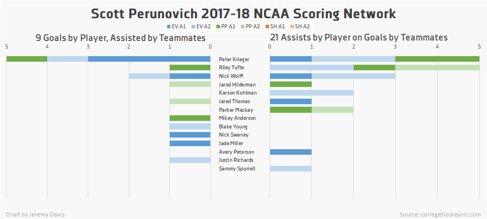 Perunovich is a good skater, both quick and agile, and has the slipperiness factor that allows him to elude heavier players around the ice. His greatest assets are his vision and puck skills, which he uses to great effect both breaking out of his zone and setting up offensive chances at the other end. He demonstrates patience with the puck, waiting out defenders rather than piling shots into their shin pads, or else moving it deftly around the attacking zone. As a result, his shot rate isn’t as high as it potentially could be, but it’s an adjustment that has led to offensive opportunities nonetheless.