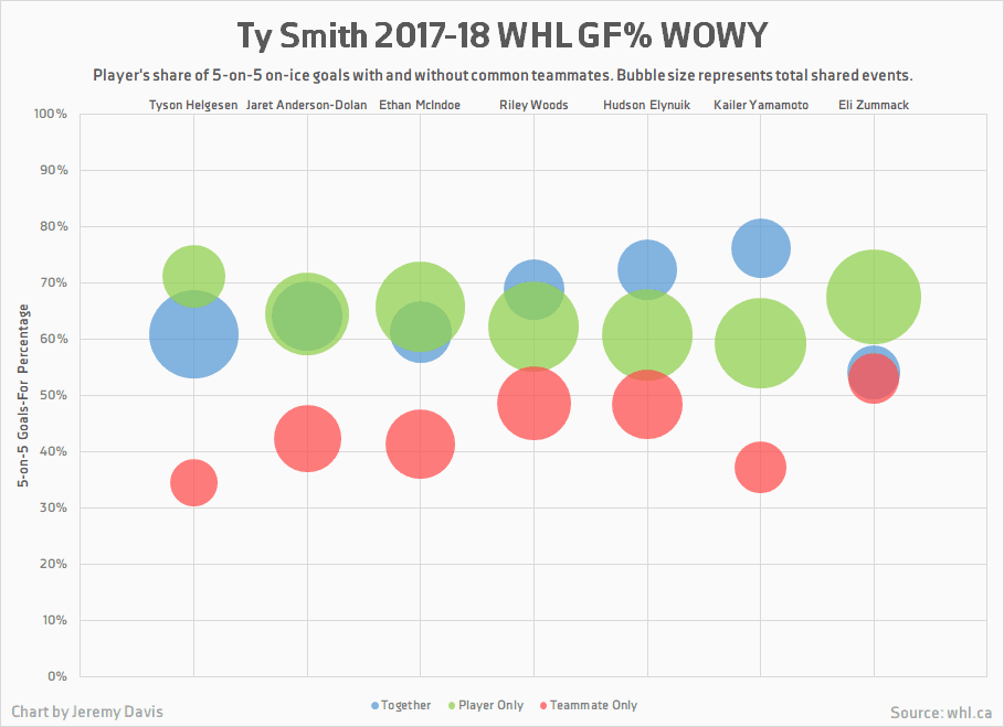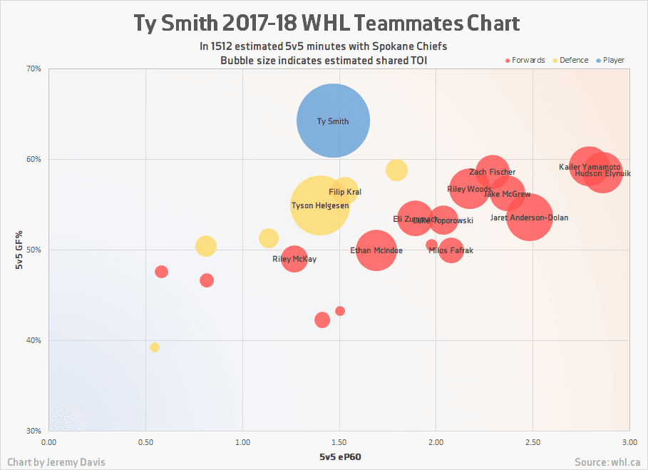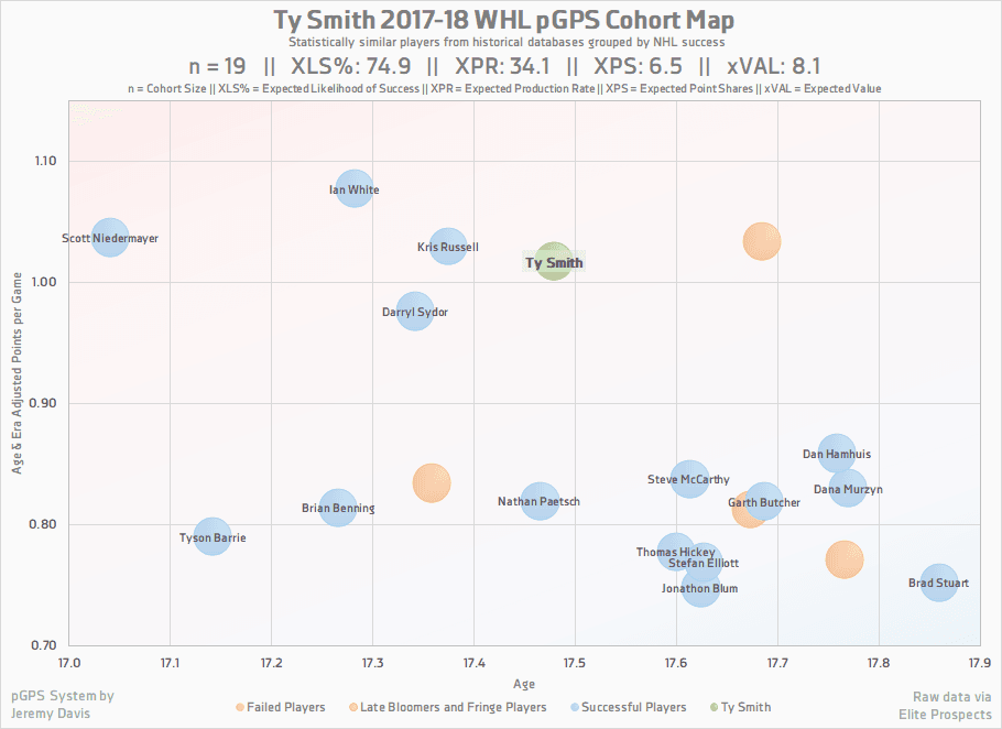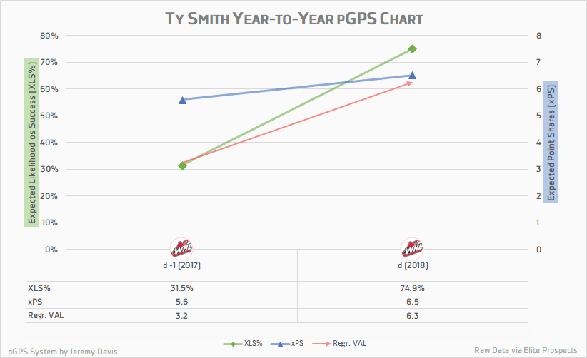 When viewed through the lens of the prospect Graduation Probabilities System, Ty Smith looks like one of the draft’s safest bets. He carries an expected likelihood of success of 75% and an expected production of just over 34 points per season. When accounting for this, his impressive inputs, and how favourably his numbers compare to some recent WHL grads, he looks like a low-risk pick with a potentially high reward; which could make him a great target for a team looking to trade down.