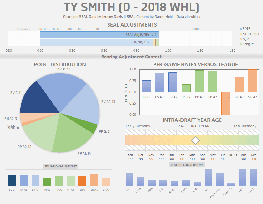 With that out of the way, let’s talk about what makes Smith a potentially special player. Offensively, Smith had the most impressive season for a first-time draft-eligible defenceman in the WHL in 15 years. Here’s a look at the best WHL seasons by points-per game by a defenceman since 2005-06: