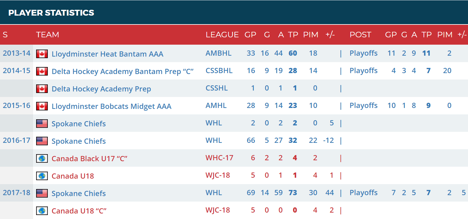 - Draft Year Team: Spokane Chiefs (WHL)