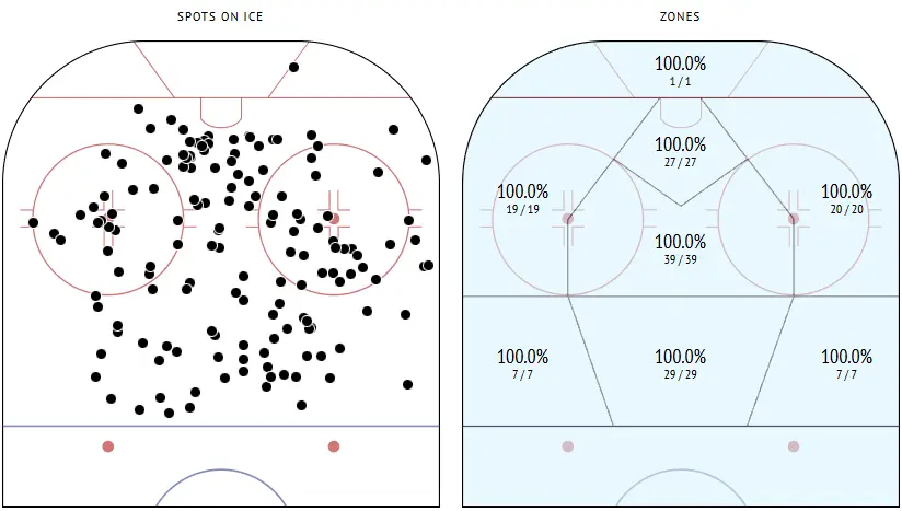 In previous seasons, there were stretches when his defensive engagement wavered. He could cheat for offence or disengage when plays moved away from him. This year, we find him to be more dialled in and appear more involved, which likely happens from the simple move to the middle. He’s supporting lower in the zone and getting back into structure quicker.