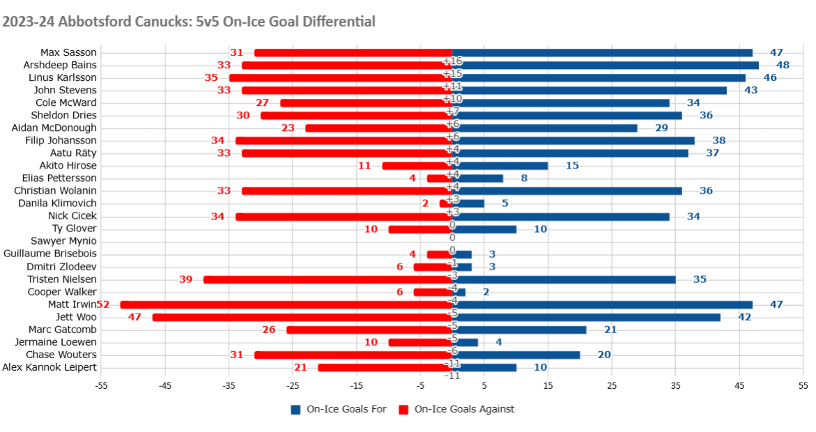The Michigan native finished fifth on the team in points — 10th among AHL rookies — with 18 goals and 42 points in his first year as a pro. While these aren’t incredible numbers for an overaged rookie, he did finish third on the team in 5v5 points — with 30 of his 42 coming at 5v5 — and finished second in 5v5 points-per-game, scoring at a 0.54 scoring clip.