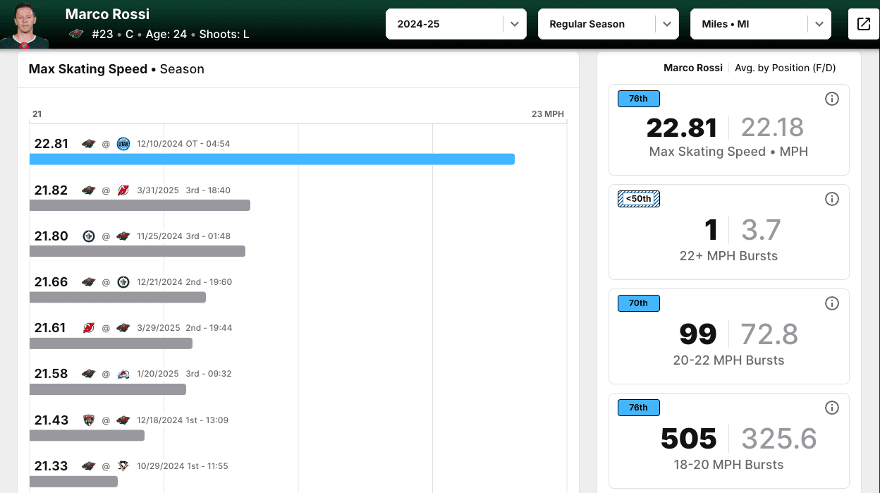 He hit his top speed of 22.81 MPH in an overtime game against the Utah Hockey Club. However, that was his only speed burst over 22 MPH all season. And that is reflected this season as well. Rossi has just one burst over 21 MPH, but that was 21.73 MPH. So, he has the rare fast burst, but at the end of the day, he is often not a burner.