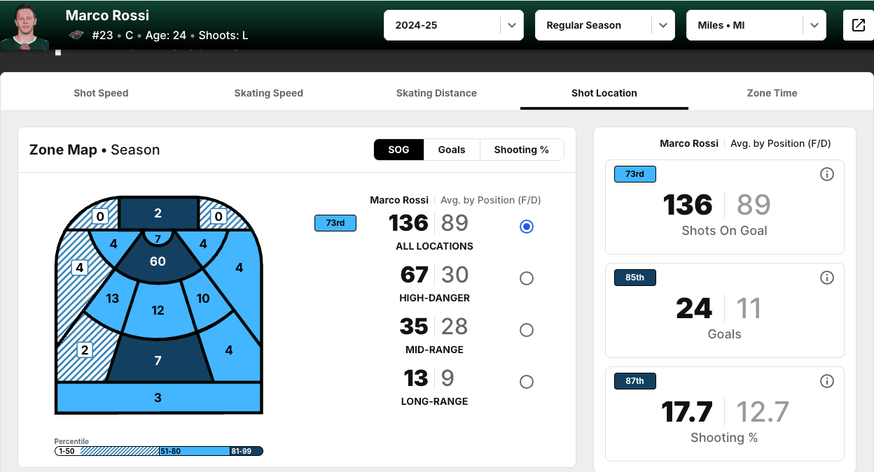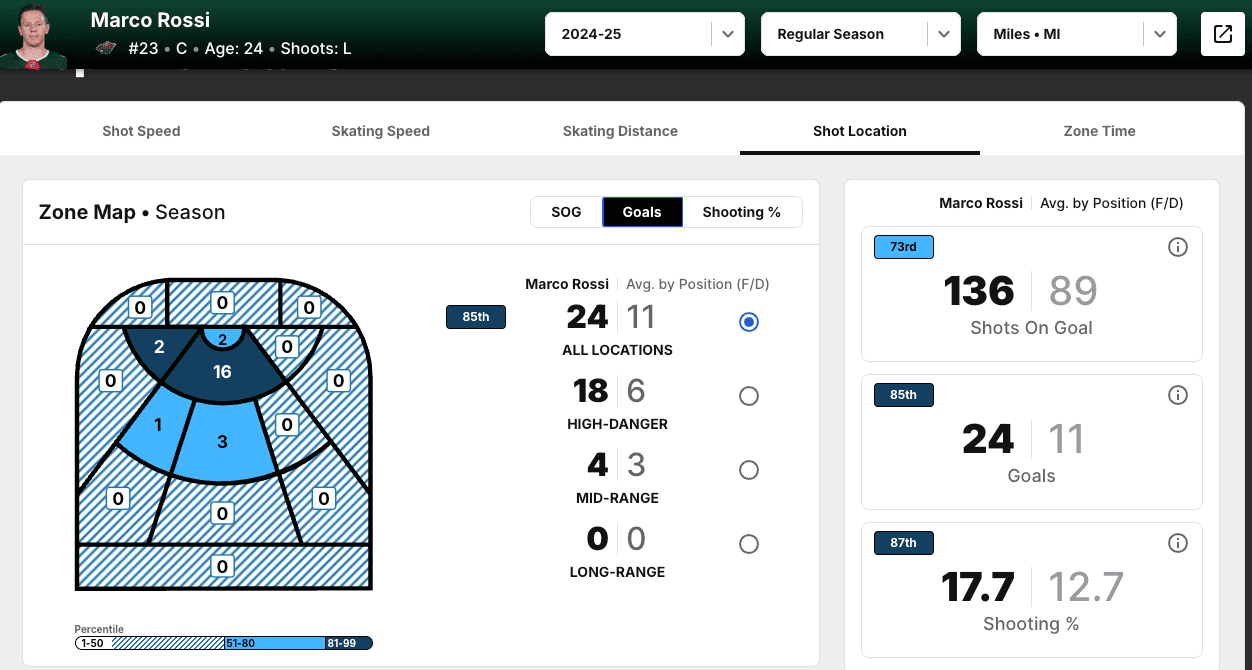 Of the 24 goals Rossi scored last season, 18 of them came from the high-danger areas in front of the net. Two from the side of the net, and four from a bit more distance, but did not score off a shot from the perimeter.